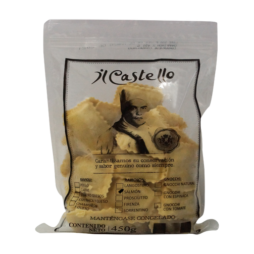 Pastas IlCastello Raviolon Salmón 450g, presentación institucional.